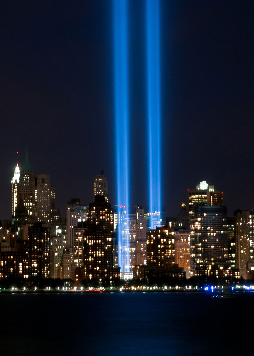 - Лучи света в ночном небе. Памятник жертвам 11 сентября. Нью-Йорк, США
