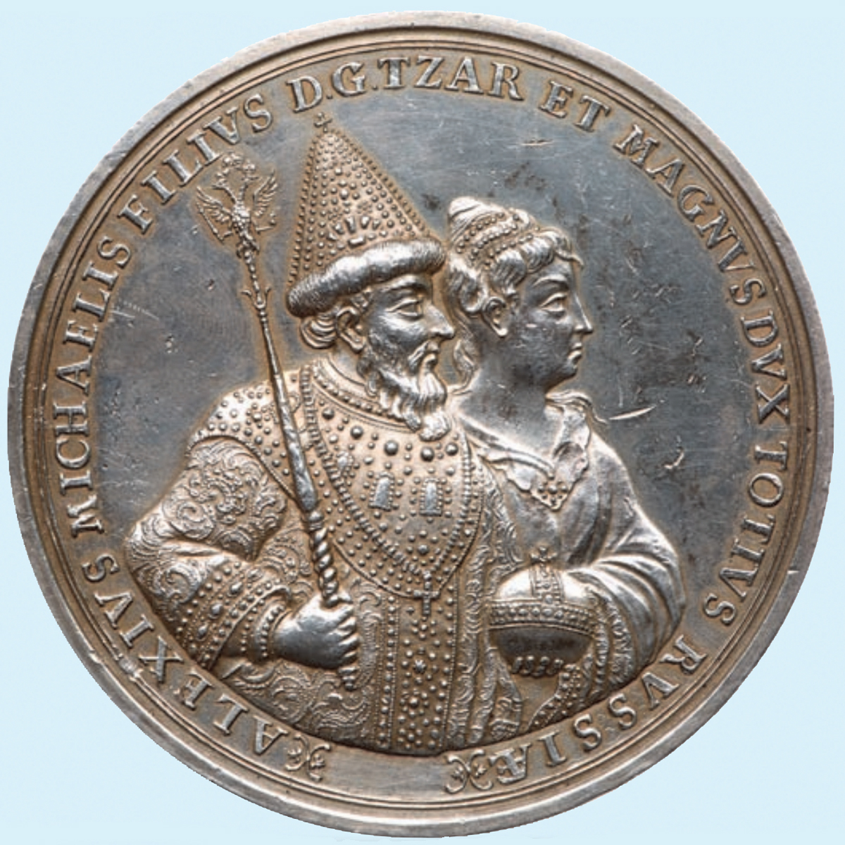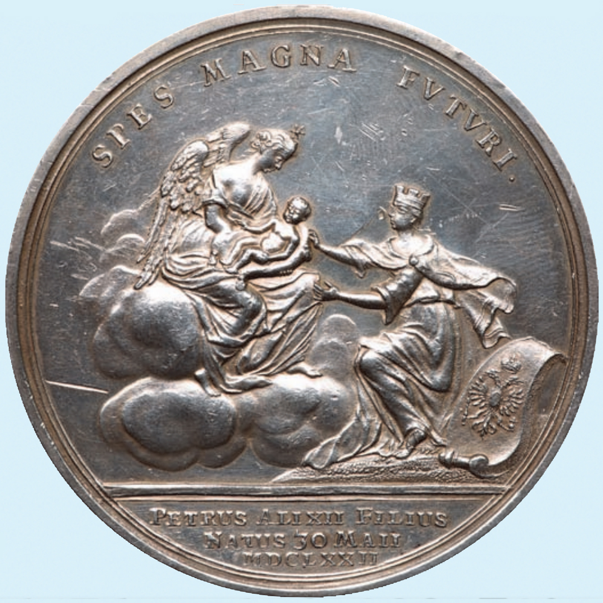 Необыкновенно интересная и редкая памятная медаль, выставленная на нью-йоркском аукционе, была связана с именем Петра I. Царь Алексей Михайлович, отец будущего великого императора, за свой кроткий нрав еще при жизни получил от подданных прозвище Тишайший. У него уже родилось 13 детей от первого брака с Марией Милославской, большинство из которых умерли в младенчестве. Во втором браке с Наталией Нарышкиной, Петр был первенцем.