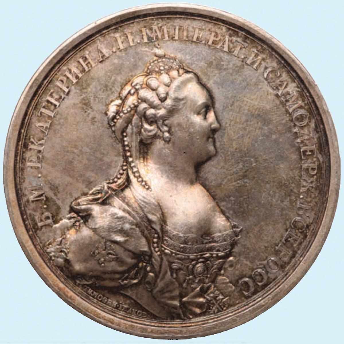 Еще больший азарт коллекционеры проявили на торгах серебряной медали в честь закладки Исаакиевского собора в Санкт-Петербурге, отчеканенной в 1768 году все тем же мастером Тимофеем Ивановым. Эта замечательная, очень редкая работа была продана почти в пять раза дороже объявленной цены.