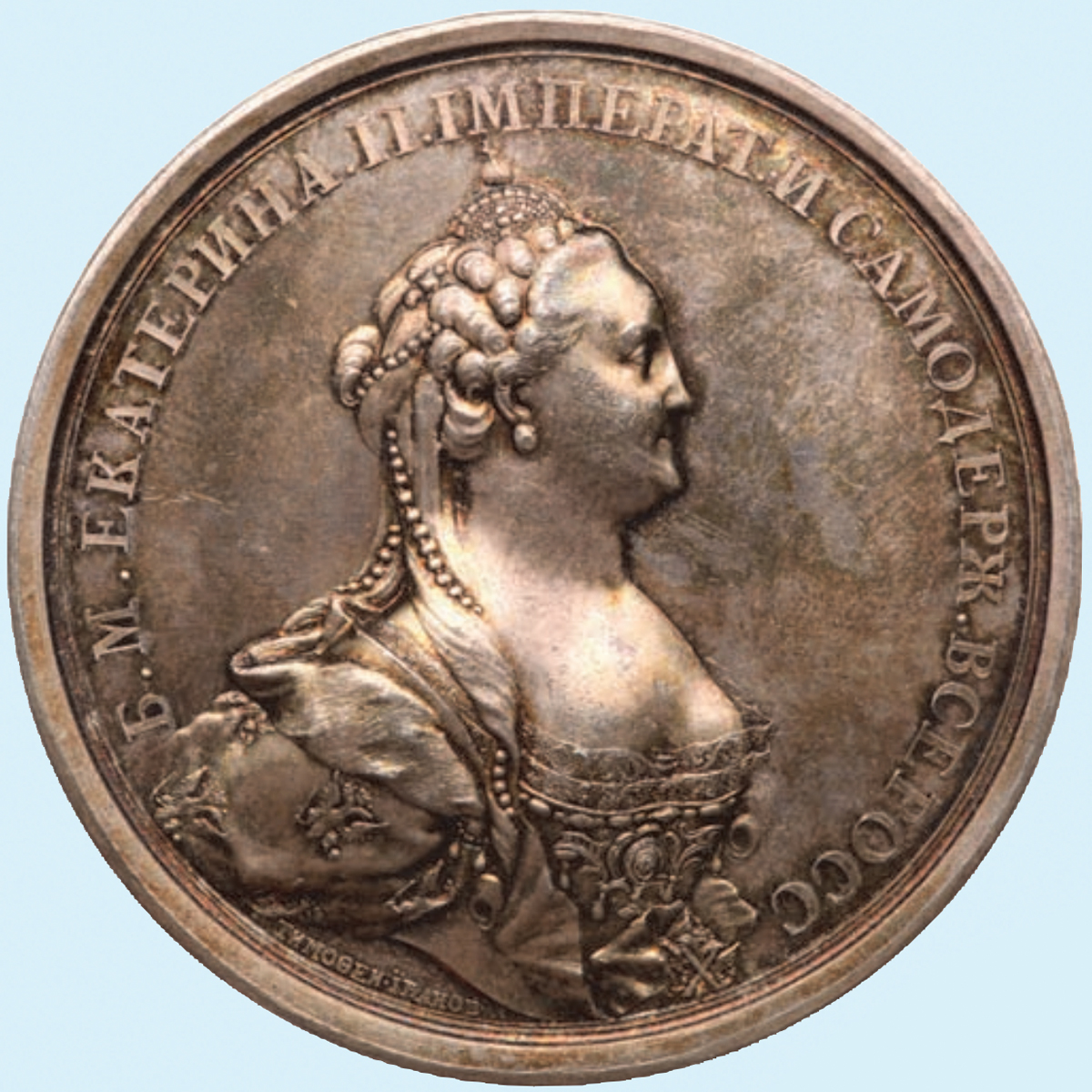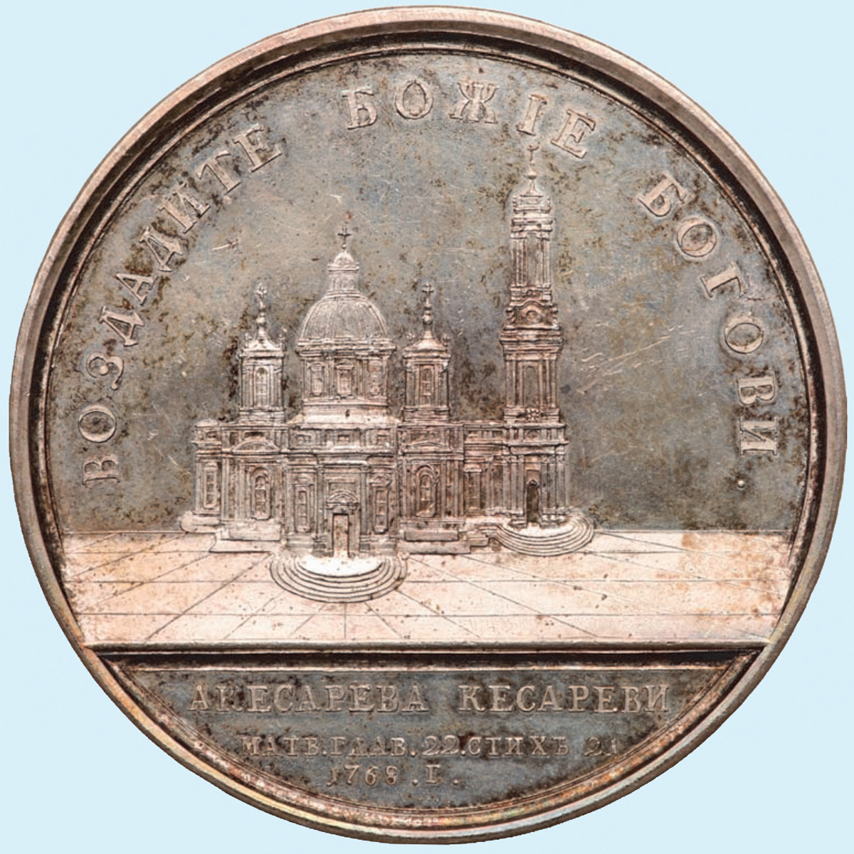 Серебряная медаль в честь закладки Исаакиевского собора в Санкт-Петербурге. 1768. Мастер Тимофей Иванов. (продано: $ 26,000)