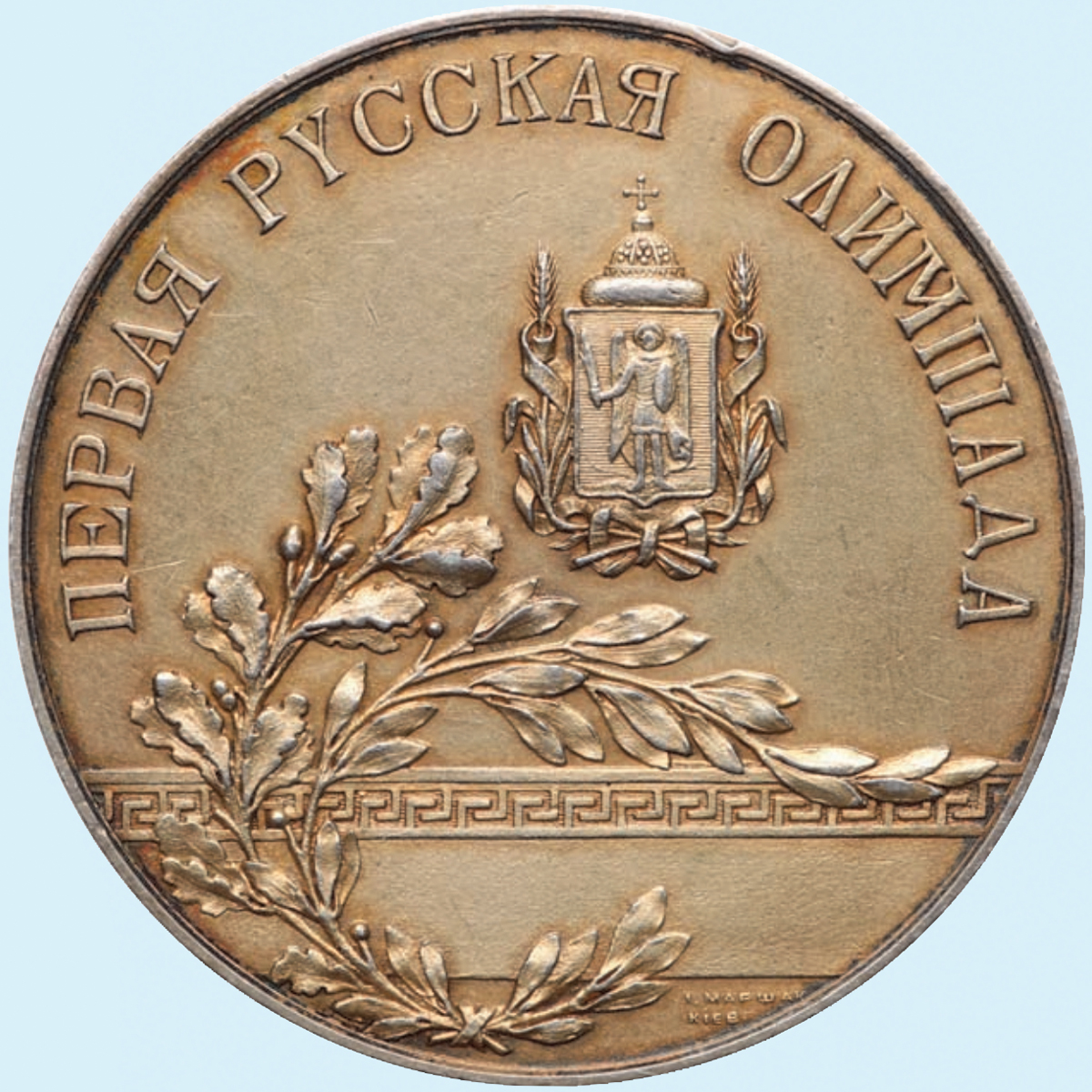 Очень редкая медаль. Было изготовлено всего несколько сотен золотых, серебряный и бронзовых медалей для участников Первой Всероссийской Олимпиады 1913 года в Киеве. Сделал наградную медаль первой российской Олимпиады киевлянин Иосиф Маршак – ювелир, купец и меценат, главный конкурент Феберже.