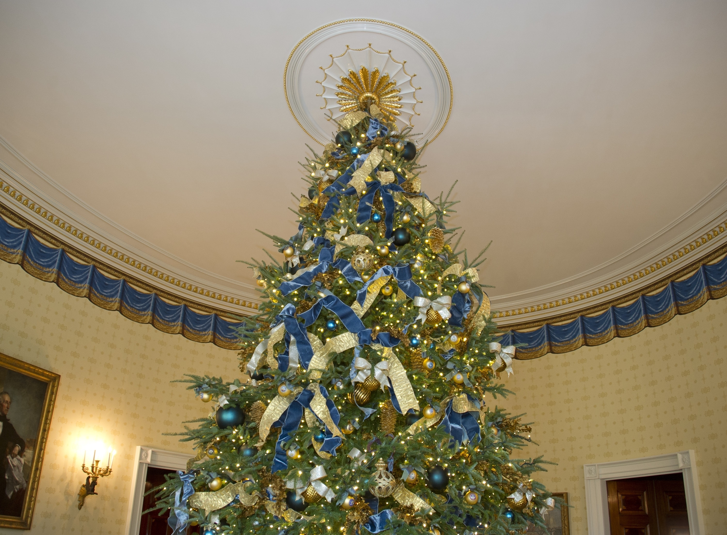 В «Голубой комнате» размещена официальная рождественская елка Белого дома, на которой висят стеклянные шары с изображениями каждого штата США.
