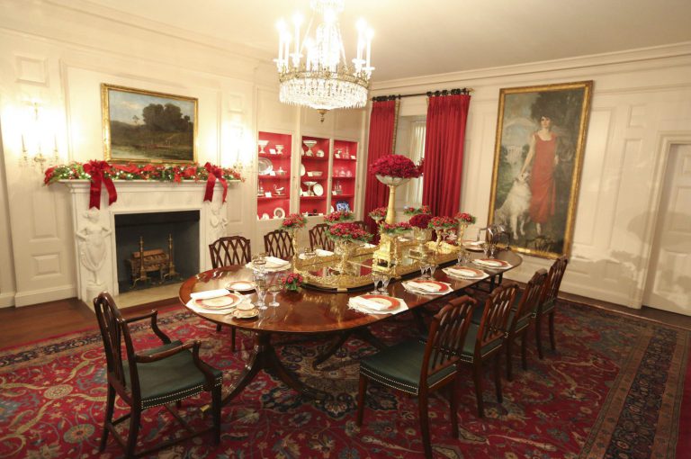 В Китайской комнате стол сервировали фарфором Рональда Рейгана и поставили красные цветы — дань традиции собираться на ужин всей семьей.